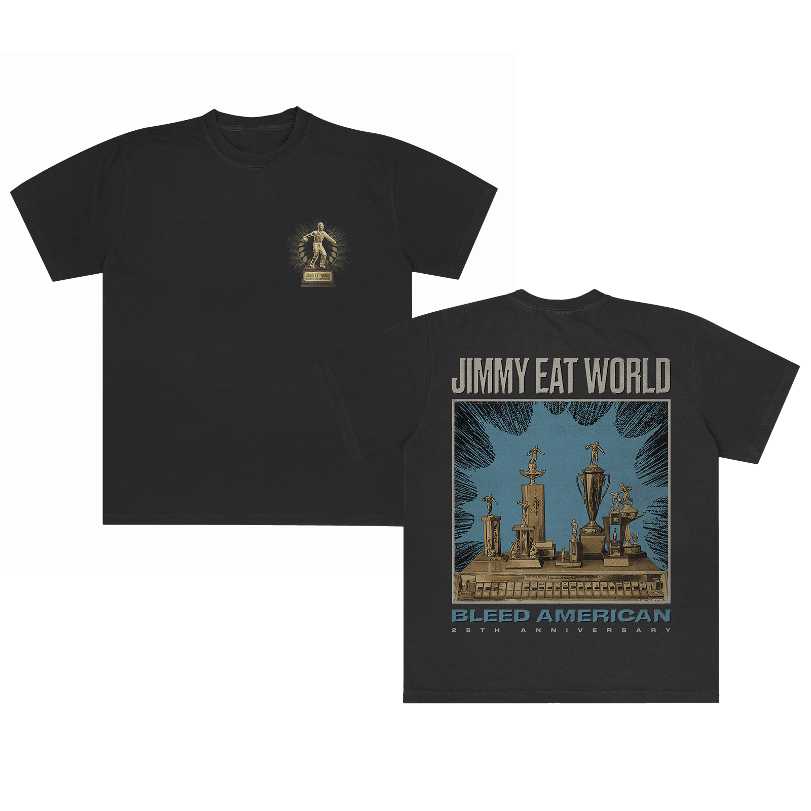 The Jimmy Eat World Bleed American 25th Anniversary design, printed on a black t-shirt.